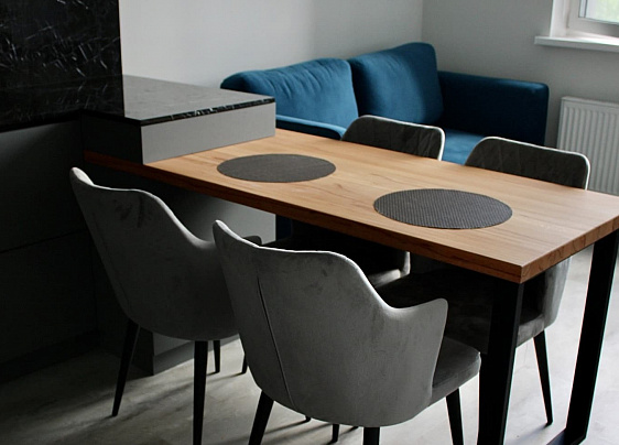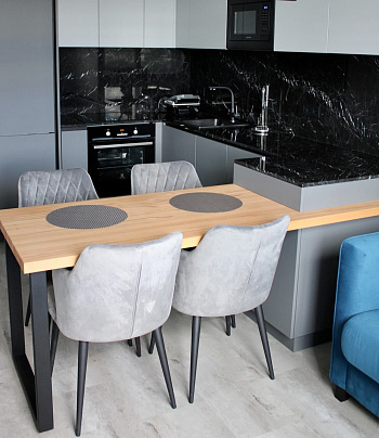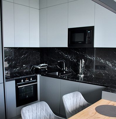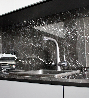 столешницей, выполненных под черный мрамор и гармонирует с обеденной зоной