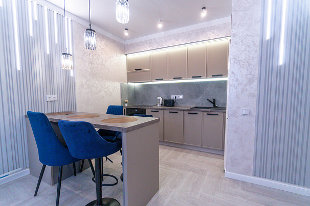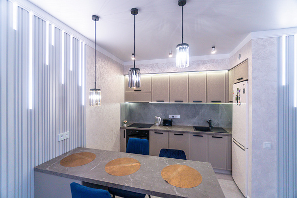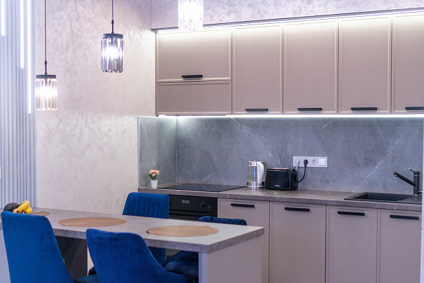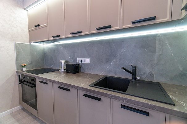 черной матовой фурнитурой и встроенной техникой. Столешница, выполненная из