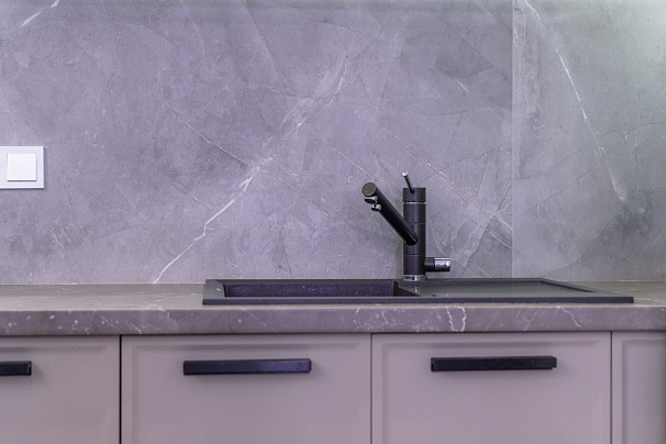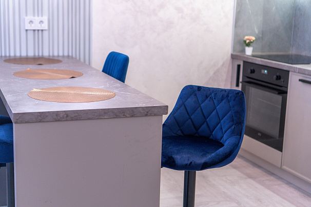 натуральных материалов, имитирующих серый мрамор. Обеденная зона представлена
