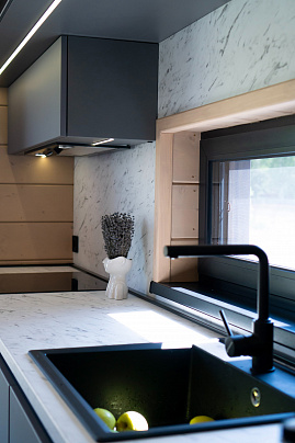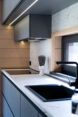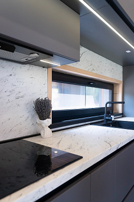 стеновая панель и столешница, имитирующие мрамор Каррара. В высоком шкафу-колонке скрыт встроенный