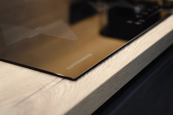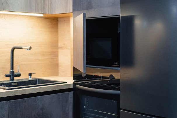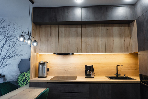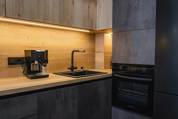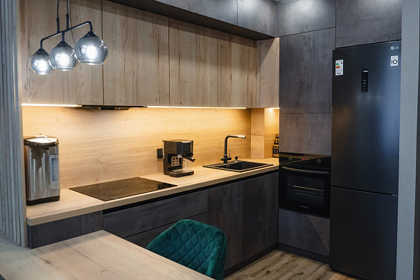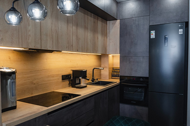 Кухня выполнена в индустриальном стиле. Уникальное сочетание фактур и оттенков достоверно имитирует штукатурку и дерево. Разная глубина секций добавляет гармоничной четкости геометрическим линиям кухни. Рабочая поверхность имеет собственную встроенную подсветку. Вместо накладных ручек в данной модели используются профиль-ручка GOLINE и сиcтема открывания шкафов push-to-open. Такое решение позволяет сохранить монолитный образ кухни и удобно открывать дверцы и ящики мебели.